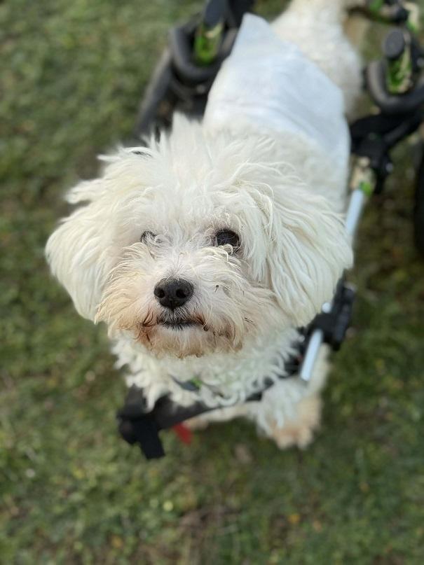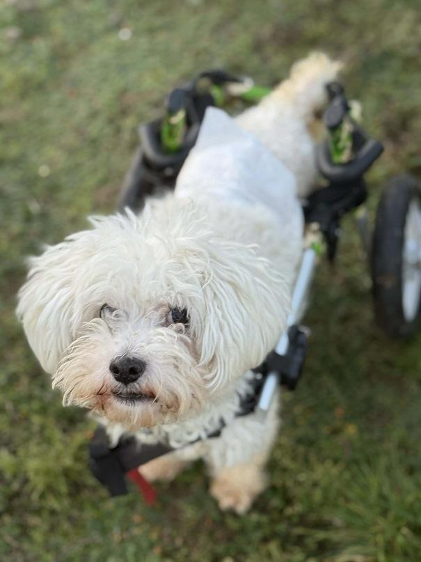 Bobby moves around using a wheelchair and requires diapers, though he can urinate and defecate on his own. He enjoys car rides, moves skillfully with his wheelchair, and gets along well with other dogs and cats. He is very people-oriented, affectionate, and loves being close to his human.